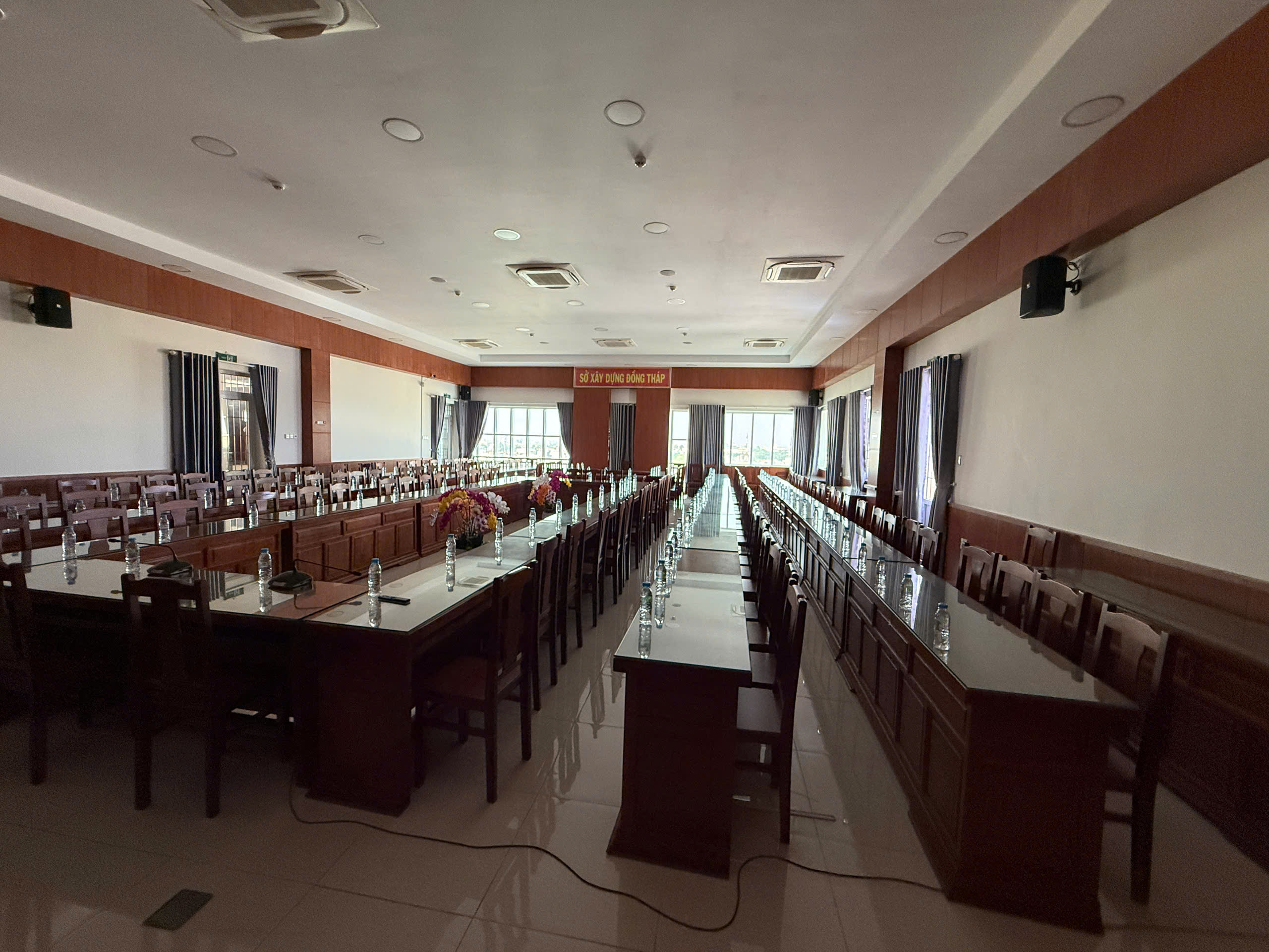 Không gian phòng họp quy mô lớn với hệ bàn dài bố trí song song, phù hợp cho: