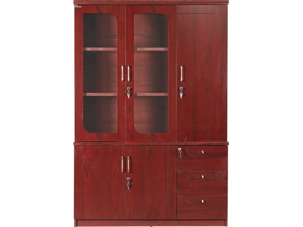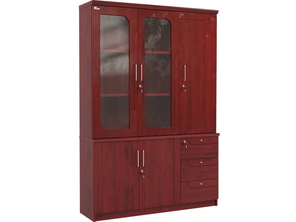 Phần dưới của tủ gồm ba ngăn kéo đặt giữa, hai bên là hai cánh mở có đợt chia ngăn bên trong. Thiết kế này giúp người dùng có thể lưu trữ tài liệu mật, hồ sơ quan trọng hoặc vật dụng cần được bảo quản riêng biệt. Các ngăn kéo trượt êm ái, cánh mở sử dụng bản lề kim loại chắc chắn, đảm bảo độ bền cao và thao tác thuận tiện trong suốt quá trình sử dụng.