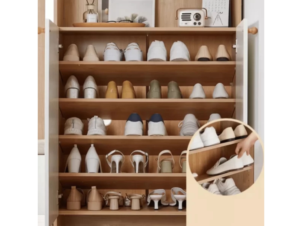Không gian bên trong Tủ giày GHT31 được thiết kế khoa học nhằm tối ưu khả năng lưu trữ và phân chia không gian. Các tầng kệ có khoảng cách hợp lý giúp sắp xếp nhiều loại giày dép khác nhau. Các ô kệ mở giúp tạo sự thông thoáng và tăng tính thẩm mỹ khi sử dụng làm vách ngăn. Nhờ bố cục hợp lý, Tủ giày GHT31 giúp không gian sống trở nên gọn gàng và tiện nghi hơn.