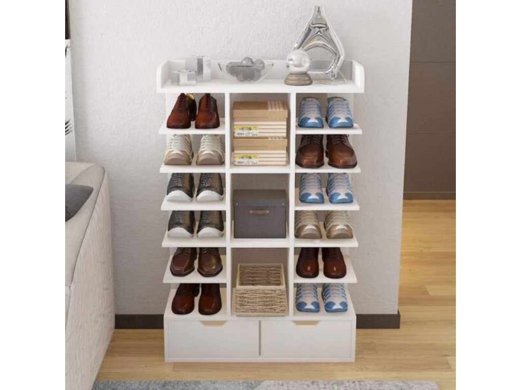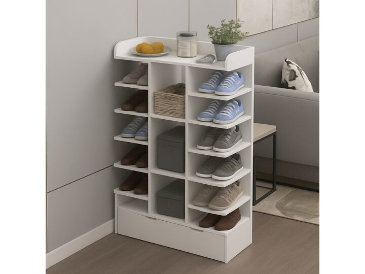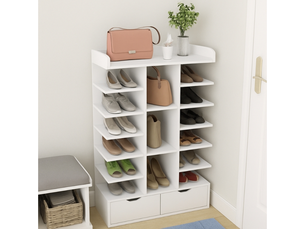 Điểm nổi bật của Tủ giày GHT44 nằm ở thiết kế nhỏ gọn nhưng vẫn đảm bảo công năng sử dụng hiệu quả. Các tầng kệ được bố trí hợp lý giúp phân loại giày dép rõ ràng và thuận tiện khi lấy dùng hằng ngày. Hộc lưu trữ hỗ trợ cất giữ các vật dụng nhỏ như chìa khóa, tất hoặc phụ kiện, góp phần giữ cho khu vực lối vào luôn gọn gàng và ngăn nắp.