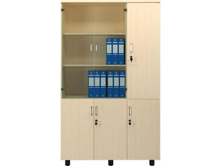 Phần dưới gồm 3 cánh mở bằng gỗ Melamine giúp người dùng dễ dàng lưu trữ những tài liệu quan trọng, vật dụng cá nhân hoặc đồ dùng văn phòng. Hệ thống bản lề chất lượng cao giúp thao tác đóng mở nhẹ nhàng, êm ái và hạn chế tiếng ồn trong môi trường làm việc. Thiết kế cánh mở dạng liền khối giúp tủ gọn gàng, đơn giản nhưng vẫn tạo cảm giác chắc chắn và chuyên nghiệp.