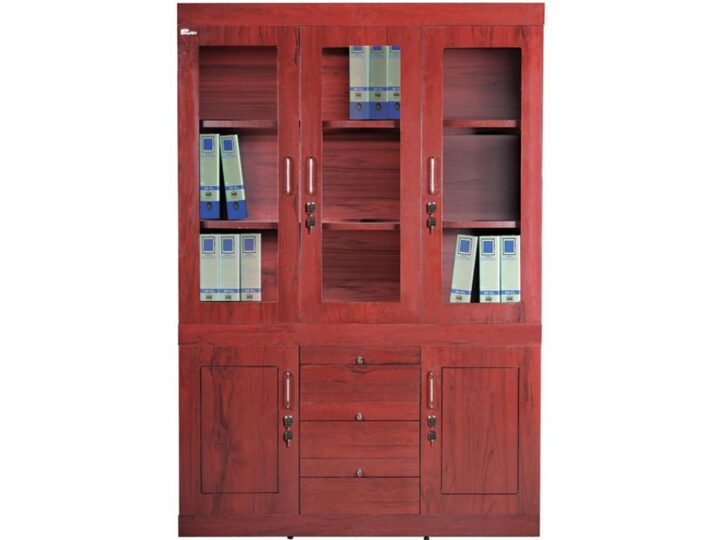 Với kích thước W1350 x D420 x H2000 mm, tủ DC1350H10 được thiết kế thành 3 khoang lớn, mang lại khả năng lưu trữ tài liệu tối ưu. Phần trên của tủ gồm 3 khoang cánh khung kính – khu vực lý tưởng để trưng bày hồ sơ, bằng khen, cúp lưu niệm hoặc sách chuyên môn. Cánh kính trong suốt được bo viền gỗ sắc nét, kết hợp với tay nắm kim loại sáng bóng, giúp tủ vừa hiện đại vừa giữ được vẻ sang trọng cổ điển đặc trưng của dòng sản phẩm gỗ sơn PU.