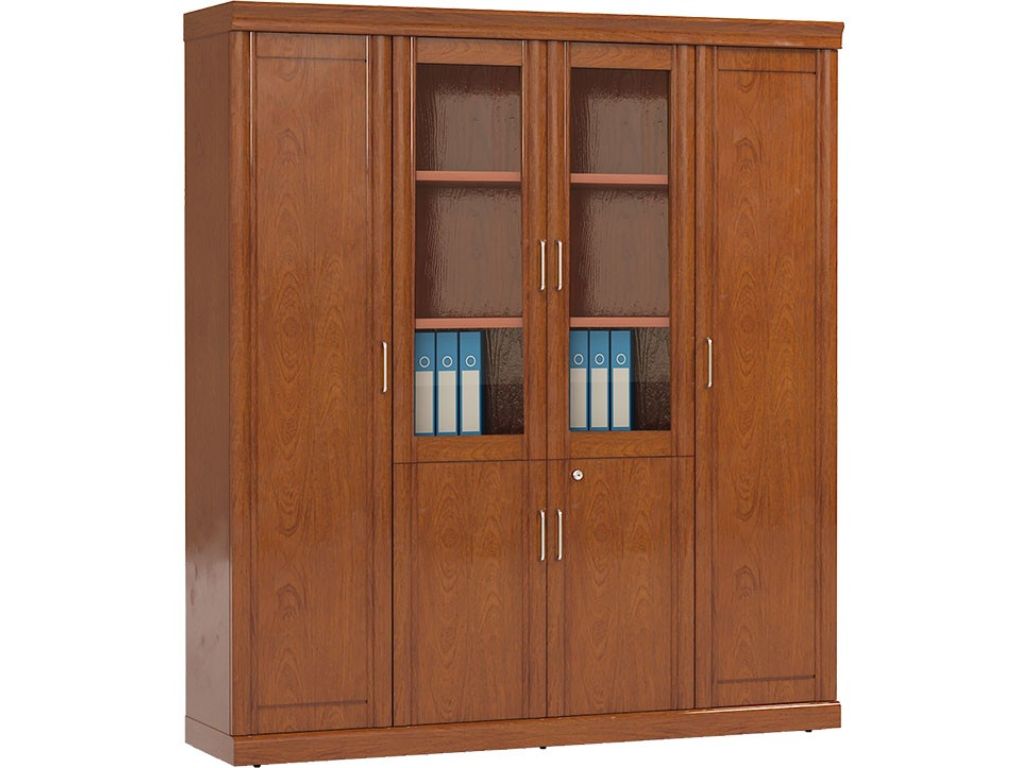Phần dưới tủ gồm hai cánh gỗ mở kín, phù hợp cho việc lưu trữ tài liệu, hồ sơ hoặc vật dụng cá nhân, giúp giữ cho văn phòng luôn gọn gàng và ngăn nắp.