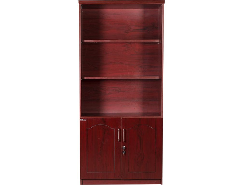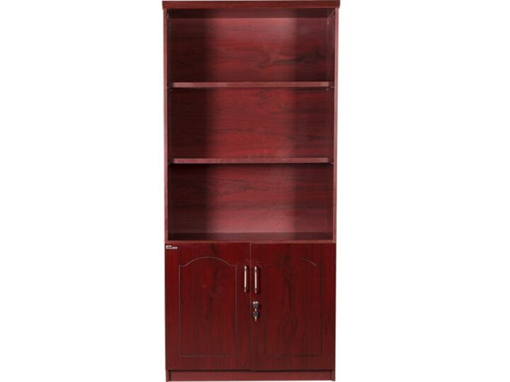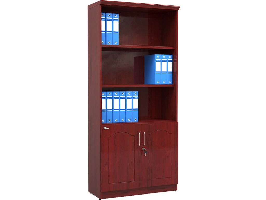Phần dưới của tủ gồm hai cánh gỗ mở với một đợt chia ngăn bên trong, mang lại không gian lưu trữ kín đáo cho các hồ sơ quan trọng, tài liệu nội bộ hoặc vật dụng cá nhân. Cánh mở được gắn bản lề chắc chắn, tay nắm kim loại sáng bóng giúp thao tác đóng mở nhẹ nhàng và bền bỉ trong quá trình sử dụng.