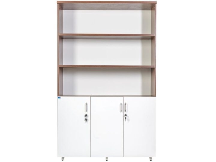 Phần trên của tủ được thiết kế mở, không có cánh, tạo nên sự thông thoáng và thuận tiện trong việc sắp xếp, lấy tài liệu. Hai ngăn cố định được bố trí hợp lý, giúp người dùng có thể trưng bày những vật phẩm trang trí, bằng khen, hồ sơ thường xuyên sử dụng hoặc tài liệu nội bộ. Thiết kế này giúp không gian văn phòng thêm sinh động, đồng thời thể hiện phong cách làm việc hiện đại, cởi mở.