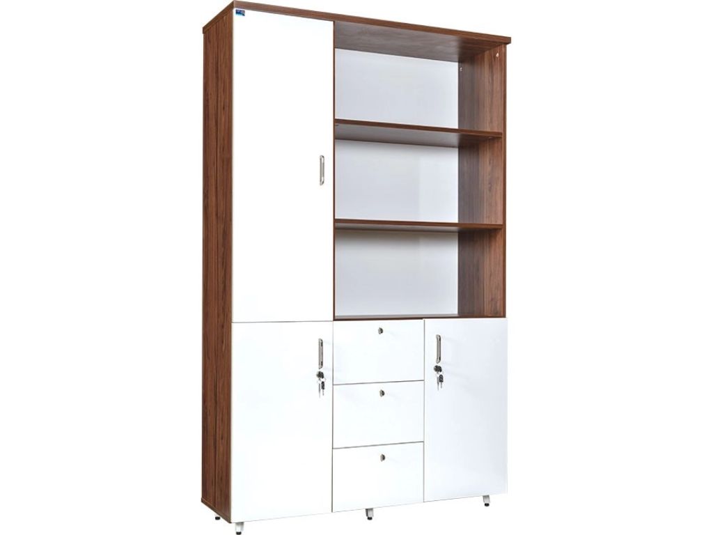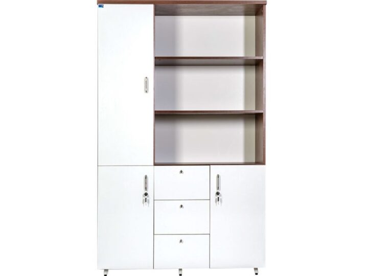 Phần khoang dưới của tủ được bố trí hai cánh mở rộng rãi, chia thành không gian lớn để lưu trữ các tập hồ sơ dày hoặc vật dụng cồng kềnh. Ba ngăn kéo phía bên cạnh được thiết kế theo bố cục dọc, rất tiện cho việc phân loại giấy tờ, văn bản, hồ sơ theo từng chủ đề khác nhau. Hệ thống ray trượt chất lượng cao giúp việc kéo mở ngăn tủ mượt mà, hạn chế tiếng ồn và đảm bảo độ bền theo thời gian.